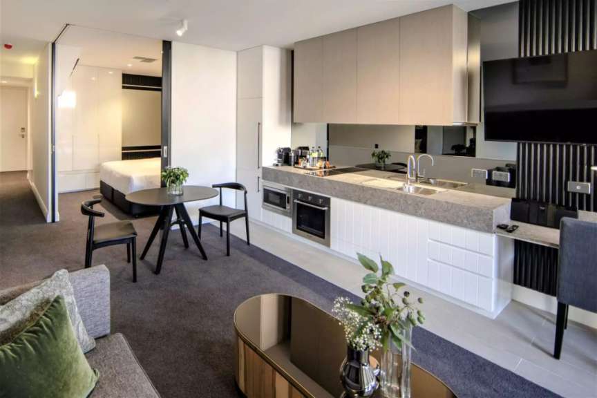 Das Apartmenthaus liegt in North Adelaide, wenige Minuten vom lebhaften Zentrum der Stadt entfernt. Jede Suite ist modern und komfortabel eingerichtet und verfügt über einen privaten Balkon oder eine Terrasse, eine voll ausgestattete Küche, ein Wohnzimmer und einen Essbereich. Allen Gästen stehen zudem eine Lounge, ein Fitnessstudio und ein möblierter Außenbereich im Innenhof offen. Im gesamten Haus sind Fotografien, Skulpturen und wunderschön gefertigte Möbelstücke des australischen Holzkünstlers Toby Muir Wilson ausgestellt. Frühstück wird in einem nahe gelegenen Café angeboten.