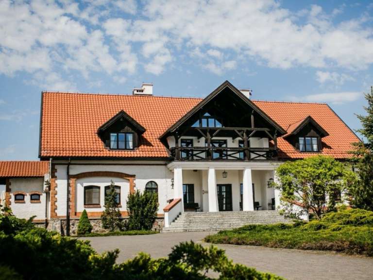 Das Ferienhotel über dem Jezioro Lasmiady (Laschmiedensee) ist eines der schönsten in Masuren – jedenfalls für Familien und alle, die Ruhe und Erholung suchen. Auf dem Hoteldach nisten bisweilen Störche und auch der zahme Hofhund fühlt sich hier sichtbar wohl. Die großzügige Anlage hat ein Restaurant mit Panoramafenstern zum See, individuell eingerichtete Zimmer und ein kombiniertes Hallen- und Außenbad. Ferner verfügt sie über einen Bootssteg, an dem Liegestühle für die Sonnenhungrigen und Paddel- und Ruderboote für die Aktiven bereitstehen; dazu gibt es noch Tennisplätze und einen Fußballplatz. Eine Wellness- und Beautyeinrichtung am See bietet verschiedene Therapien an.